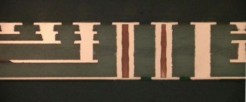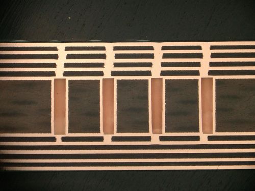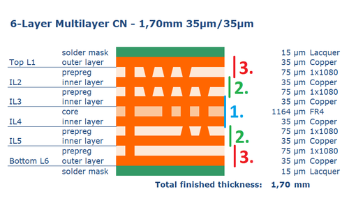 However, because only a thin prepreg is used, it's not possible to realize thicker copper layers (>35 µm) on the inner layers. The thin prepreg would otherwise be insufficient to properly fill the gaps between layers.