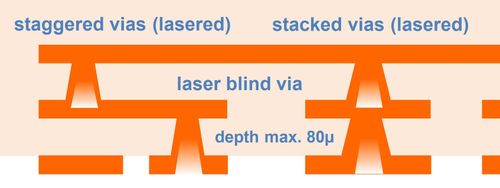Laser-Drilled Blind VIAs, also called Micro-VIAs or Laser-VIAs, are created by laser drilling rather than mechanical drilling. Since Laser VIAs are typically manufactured with a diameter of 100 µm (0.10 mm), the insulation between the start and target layers must be very thin. A single Prepreg 1080 (65–75 µm) is used for this purpose.