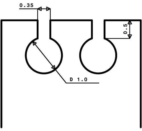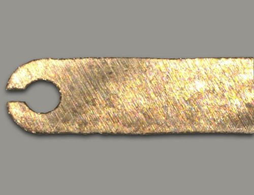 For prototypes, there is a more cost-effective alternative, though it comes with certain drawbacks (explained below). In this more economical method, neither stamping nor drilling is used; instead, the tabs are produced using strip cutting. This requires an approximately 0.4 mm wide slot for the 1 mm tin feed-through. Depending on the available space, multiple such solder feed-throughs can and should be included on the nickel tabs at the points where the connection to the PCB will later occur.